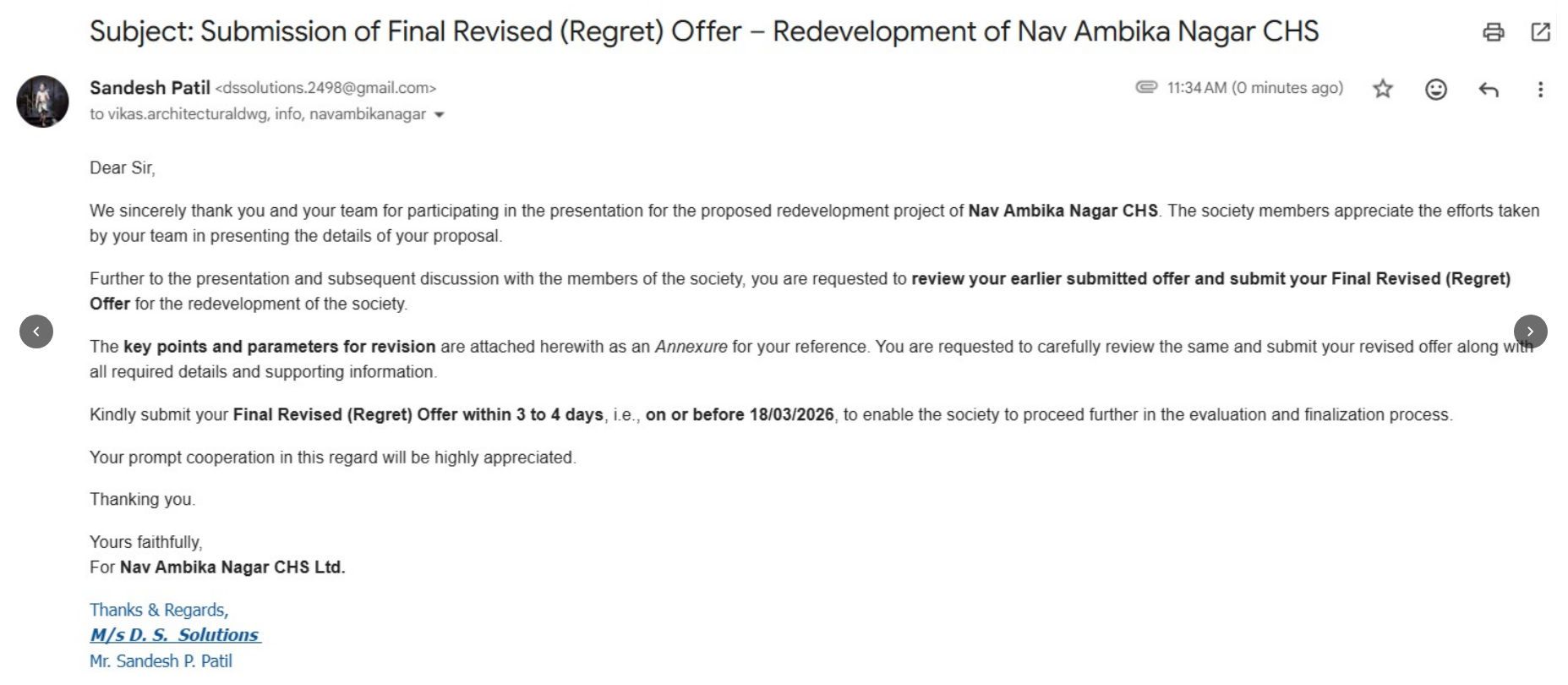 List of Builders & Developers who submitted their proposals for Redevelopment as per the meeting held in the Mandir premises on 18th Jan, 2026
